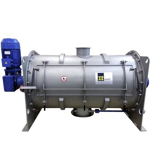 - 主要組成為:一台單支撑的驅動装置、水平攪拌軸及葉片,具複合式頻率轉換器,攪拌軸僅由端部支撑;具大型進料/出料口,以利物料快速進出