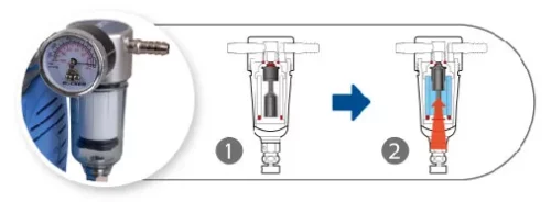 - 進氣過濾裝置:Rocker 無油式真空幫浦每個機種在進氣口均裝有濾芯,可過濾粉塵、水氣,以淨化進氣,延長汽缸及活塞的使用年限